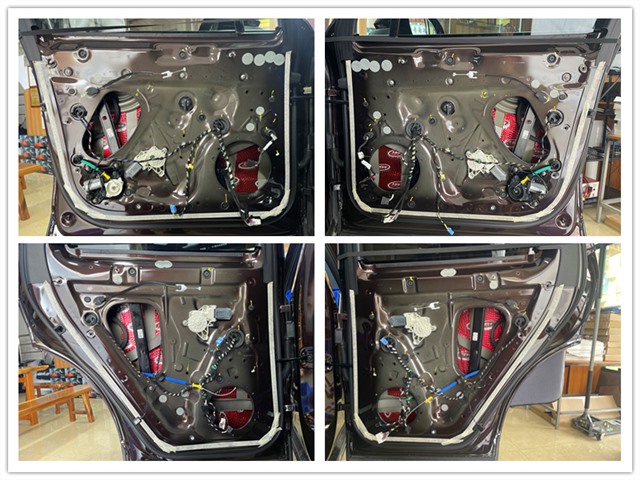 前后門板先使用大能紅派進行內(nèi)層的第一層隔音,粘貼材料較為講究,令鈑金與隔音材料直接緊密貼合,加強鈑金的剛性,減少共振