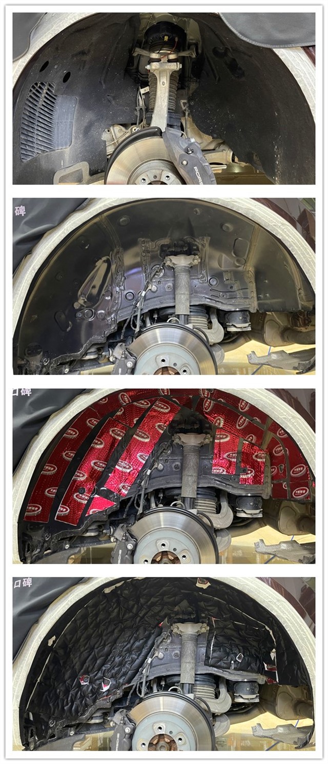 翼子板是胎噪傳遞的主要通道,同時還是排氣管噪音傳入的主要通道,為了解決這個部位的噪音問題,一共使用了三種隔音材料,分別是大能紅派、噪音終結者、超級溫莎。層層隔音可以大幅度降低胎噪的傳入,減少排氣管噪音和燥熱的傳入,讓胎噪停留在車廂以外的空間。