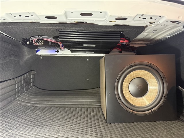 低音部分換裝勁浪 p25 FE BOX 亞麻盆 10 寸原廠箱低音,低頻下潛更深、力度更足,為音樂增添飽滿的氛圍感;功放方面,新增弗萊德 FS-4 和弗萊德 FD-1 兩臺功放,分別專門推動前后聲場喇叭和低音,確保每一套喇叭都能獲得穩(wěn)定充足的功率供給,發(fā)揮最佳性能。兩臺功放被巧妙吊裝于尾箱頂部,這種安裝方式不僅節(jié)省了尾箱空間,不影響日常儲物使用,還能有效散熱,保證功放的穩(wěn)定運行;勁浪 10 寸原廠箱低音則平穩(wěn)放置于尾箱,不占用過多空間,兼顧了實用性與音質(zhì)表現(xiàn)。
