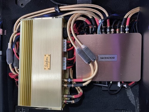 詩芬尼小黃金四路兩臺功放和一臺哥航G2音源接線完成