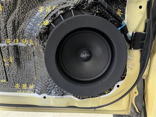 本次的音響升級,前聲場使用詩芬尼S62兩分頻套裝,詩芬尼有著出色的人聲演繹,播放的音樂十分耐聽,讓人不容易產生聽覺疲勞。高音、中低音無損安裝,中低音安裝時還加裝了美音圈,能填充原車內飾板和喇叭間的間隙,防止音效擴散,讓聲音集中向車內傳出,吸收車門噪音,提升喇叭音質的功效。