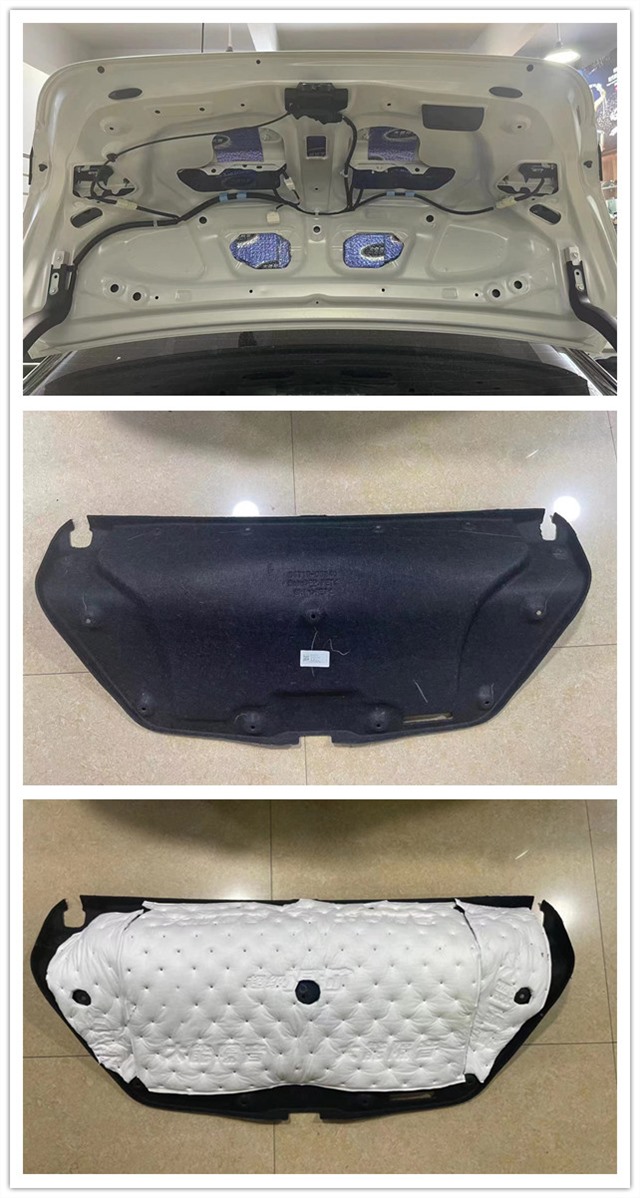 我們的汽車引擎蓋是離發(fā)動機的距離最近的,發(fā)動機工作時就會不斷引起周邊金屬的振動,然后將噪音進行傳遞,熱量的產(chǎn)生也會對引擎蓋進行烘烤,導(dǎo)致漆面老舊,影響漆面的美觀。所以改裝師使用大能藍金剛做第一層止振的基礎(chǔ),再貼上銀衛(wèi)士作為第二層,有了銀衛(wèi)士的加入,讓隔音隔熱產(chǎn)生立竿見影的效果。