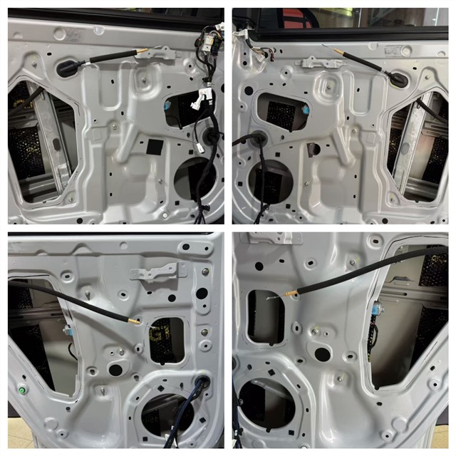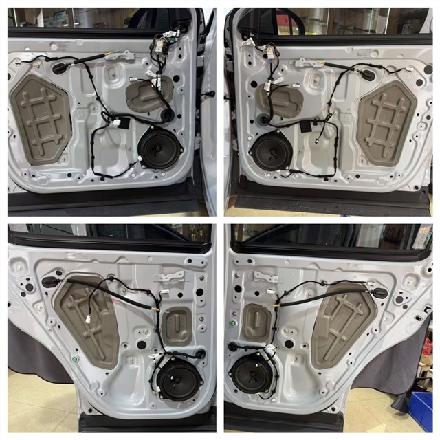 施工伊始,技師拆開比亞迪元的前后門板,原車簡陋的鐵皮結構暴露無遺,缺乏有效的隔音處理,不僅容易產生共振噪音,還會嚴重影響喇叭音質發揮。為此,泉州海林汽車音響選用 GT 四門隔音材料,對前后門板內層進行全面止振處理,有效抑制鈑金共振;后門板外層完成隔音施工后,再精準安裝喇叭,雙重防護大幅提升門板密封性,為音響系統搭建穩定的發聲環境。