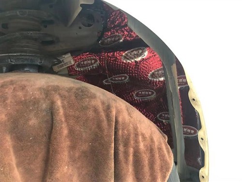 輪弧是胎噪來源的重要部位之一,這些噪音在輪拱內側形成的空腔里被來回旋轉、反射和放大,并通過鈑金震動、孔洞和車門縫隙向車內傳遞,嚴重影響駕乘舒適性。海林改裝師采用大能紅派隔音材料對輪弧及輪弧襯板進行多層隔音處理,特別要注意的是,隔音材料粘貼完成后需要使用壓滾工具將隔音材料壓實,壓緊。避免今后行車的過程中隔音材料的脫落。
