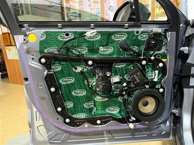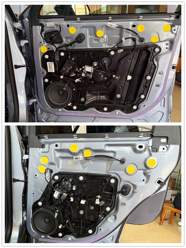 在進行音響改裝之前,我們首先對林肯冒險家的門板進行了仔細檢查。拆開門板飾蓋后,發現原車門板的隔音措施并不盡如人意。為了提升音響的表現,減少外界噪音對車內音質的影響,我們使用大能超級盾對四門進行隔音。