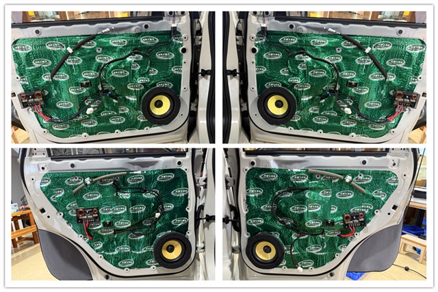 為了給喇叭創(chuàng)造一個(gè)更加安靜、干凈的聽音環(huán)境,改裝師使用大能超級(jí)盾對(duì)四門和尾箱區(qū)域進(jìn)行了專業(yè)隔音處理。大幅削減車內(nèi)共振和噪音干擾,提升整體車廂靜謐性。在與車主充分溝通后,前后聲場(chǎng)選用法國(guó)勁浪ES 165 KE兩分頻,中低音原位安裝在前后門板,搭配隔音處理,有效提升中頻飽滿度和低頻的下潛力度;高音分別安裝在前門三角位和后門板上。