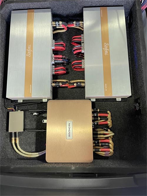 兩臺詩芬尼MA130.4功放和歌航G2高端主機整齊接線安裝在尾箱凹槽位置