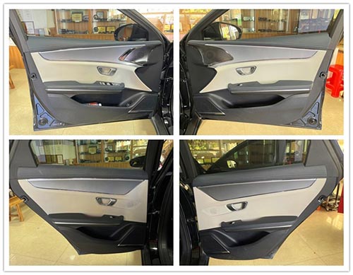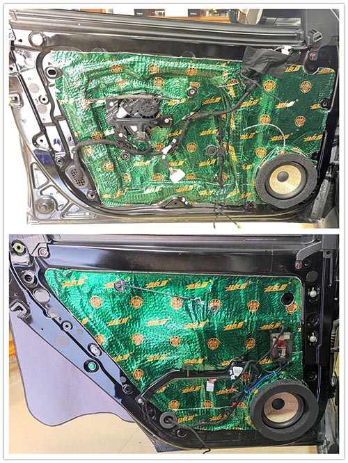 在充分溝通和理解車主日常廣泛的聽音需求后,改裝師為比亞迪E9量身定制了一套音響改裝方案。首先,以營造純凈聲場環境為起點,使用大能超級盾隔音材料對四門進行了深度的專業隔音處理,旨在消除行駛過程中的噪音干擾,構建一個理想的箱體空間。