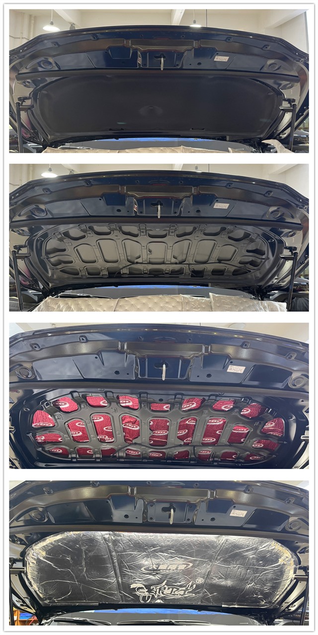 原車的引擎蓋隔音措施很欠缺,只有一層單薄的鐵皮結(jié)構(gòu),因此對引擎蓋做隔音是很有必要的。改裝師主要對引擎蓋做了雙層隔音處理,第一層使用大能紅派進行隔音止振,第二層使用大能銀衛(wèi)士,阻隔發(fā)動機熱量烘烤引擎蓋漆面而導(dǎo)致老化,延長引擎蓋壽命,達到隔音的目的。