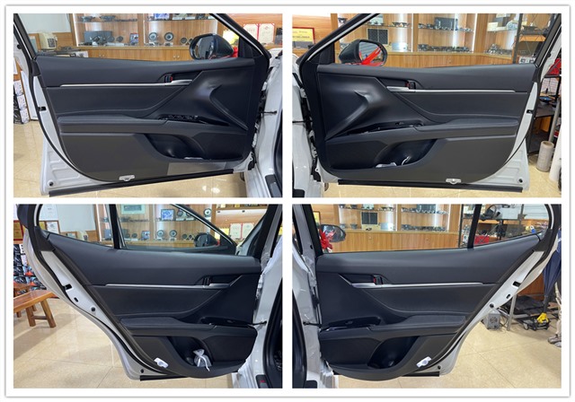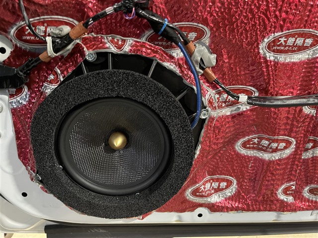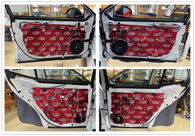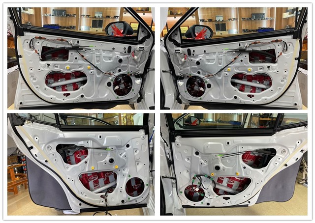 音響升級,首先從隔音抓起,車門正在采用大能紅派進行第一層隔音處理,使車門變得更加厚實,有效減少震動,降低噪音分貝,為中低音喇叭提供更好的工作環境。