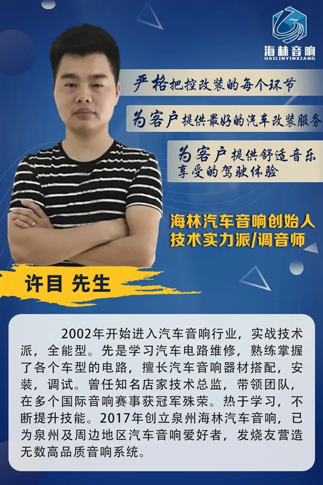 一直以來,泉州海林致力于專業(yè)汽車音響改裝,隔音降噪,創(chuàng)始人許目先生更是從2002年入行汽車音響行業(yè),距今已20多年,在工作中,不斷學(xué)習(xí),鉆研,先是學(xué)習(xí)汽車電路維修,熟練掌握各個車的車型電路,還擅長汽車音響器材搭配,安裝,調(diào)試等,外地過來調(diào)音的車友好評如潮。
